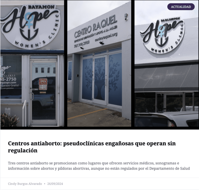 Mientras, la periodista Cindy A. Burgos Alvarado y el fotoperiodista Brandon Cruz González obtuvieron una mención de honor en el género de reportaje investigativo por el trabajo Centros antiaborto: pseudoclínicas engañosas que operan sin regulación. La pieza, mediante textos y vídeo, reveló que, en Puerto Rico, donde el aborto es legal, tres centros antiaborto se promocionan como lugares que ofrecen servicios médicos, sonogramas e información sobre abortos y píldoras abortivas, aunque no están regulados por el Departamento de Salud. En la práctica, mediante engaño y manipulación, buscan obstaculizar el ejercicio del derecho al aborto para mujeres y personas trans gestantes. La investigación fue posible, en parte, gracias al apoyo de la Beca Poder Elegir, que se otorgó en el Festival Zarelia 2024, en Quito, Ecuador.