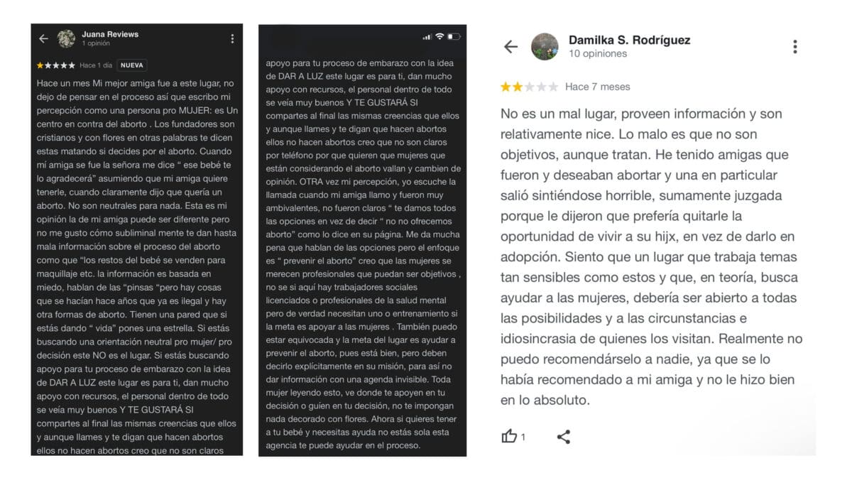 Capturas de pantalla de opiniones dejadas en Google Maps sobre los servicios de Hope Women’s Clinic. Muchas de estas han sido borradas.