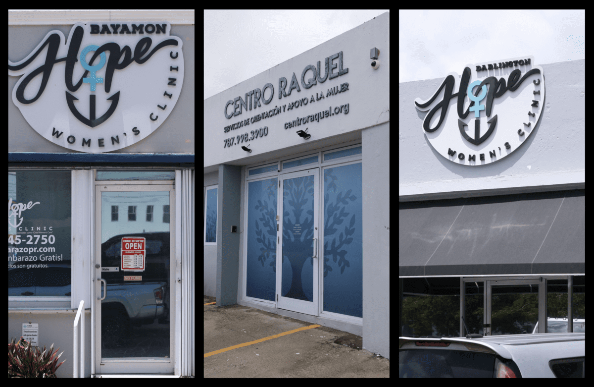 Hope Women’s Clinic tiene dos establecimientos: el que visitó María en Bayamón, que es el primer “centro de crisis de embarazo” en Puerto Rico y abrió en 2016 a pasos del Centro de Planificación Familiar, una clínica legítima de abortos; y el segundo, que abrió este año en Río Piedras, casi al lado de Darlington Medical Associates. En Carolina, está el Centro Raquel, cerca de Women’s Medical Pavillion, que es otra clínica regulada para interrupción de embarazos.