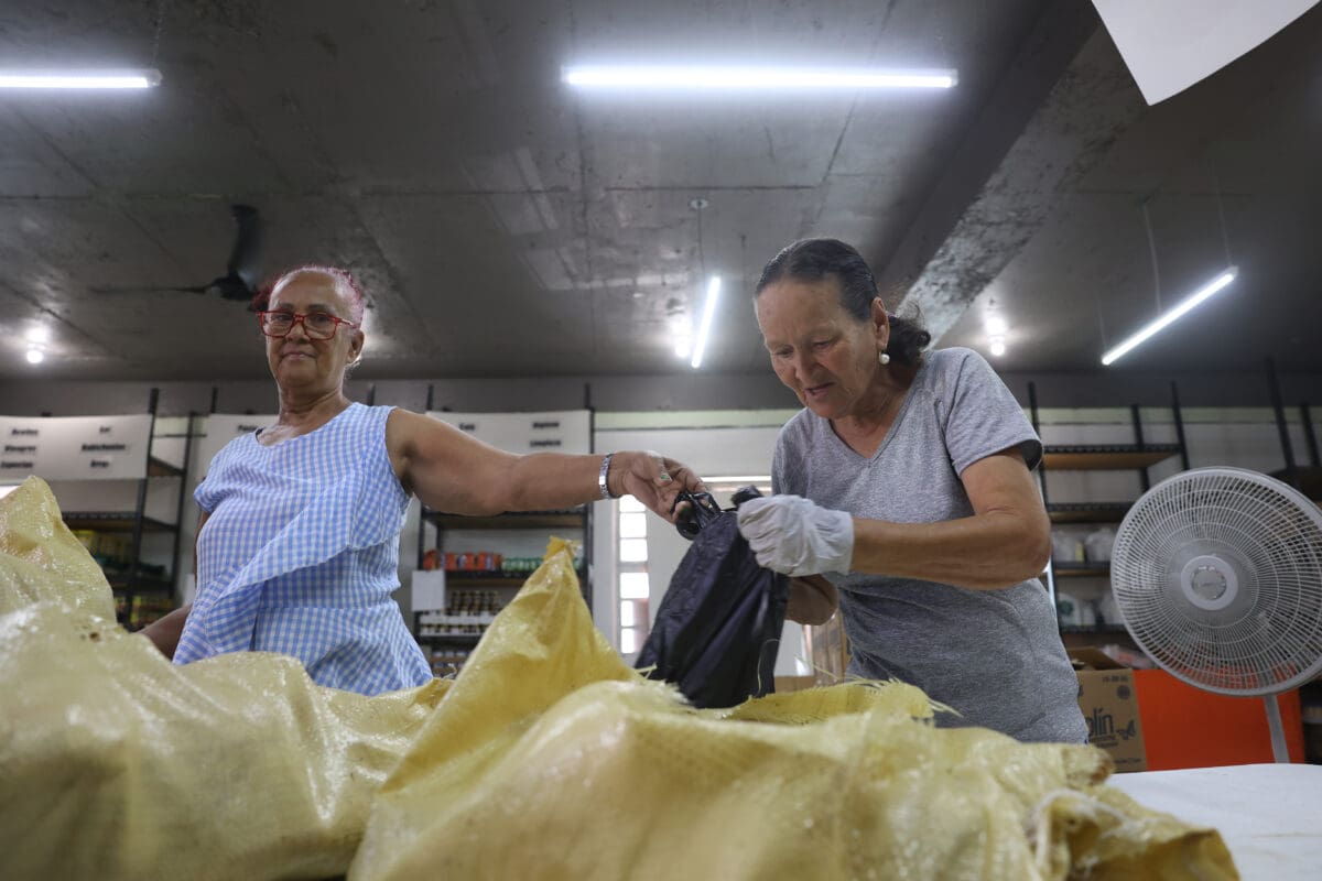 Otras mujeres voluntarias la acompañaban en el proceso de rellenar bolsas con el resto de los productos agrícolas que componían la compra solidaria de este mes de diciembre: malanga, guineos verdes, papaya. Todos los segundos lunes de mes, un grupo de 15 a 20 mujeres voluntarias fijas se reúne para realizar esa tarea de empaque, lo que representa el 90% del voluntariado del programa.
