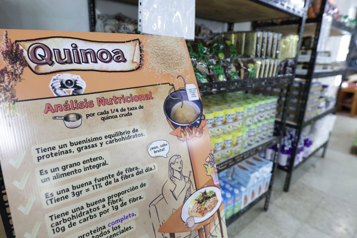El 80% de lo que se vende en el supermercado proviene de agricultores y elaboradores locales. La brigada de procesamiento del SúperSolidario elabora jugos naturales, ensaladas de fruta, sofritos, “lentuburger”, “lenturrias” (opciones veganas a base de lentejas) y salsas con los productos agrícolas que no se logran vender esos sábados.