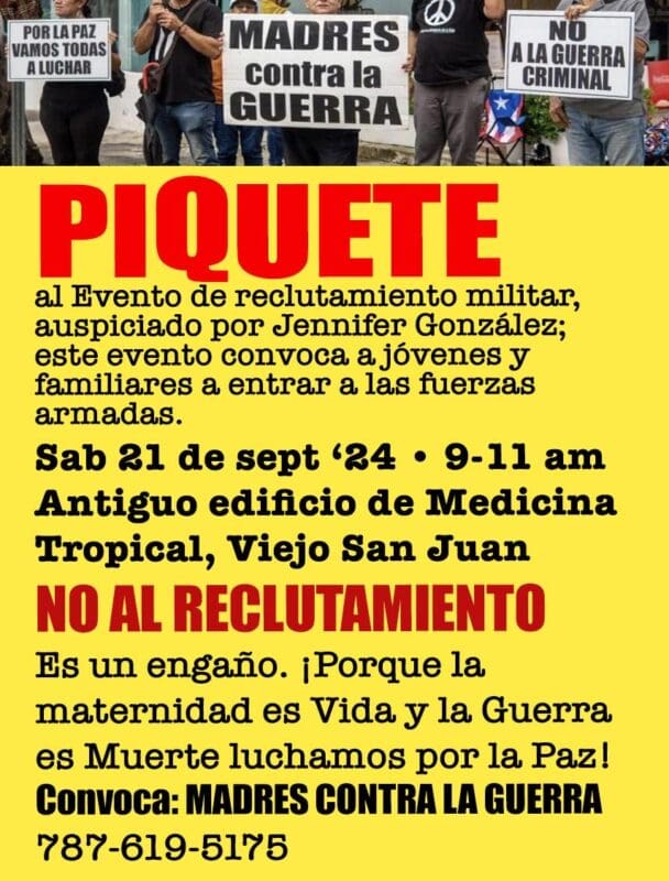 La organización pacifista y antimilitarista Madres Contra la Guerra convocó a un piquete este sábado, en el Viejo San Juan, en repudio a una actividad de reclutamiento militar para jóvenes, organizada por la comisionada residente en Washington y candidata a la gobernación, Jenniffer González Colón.