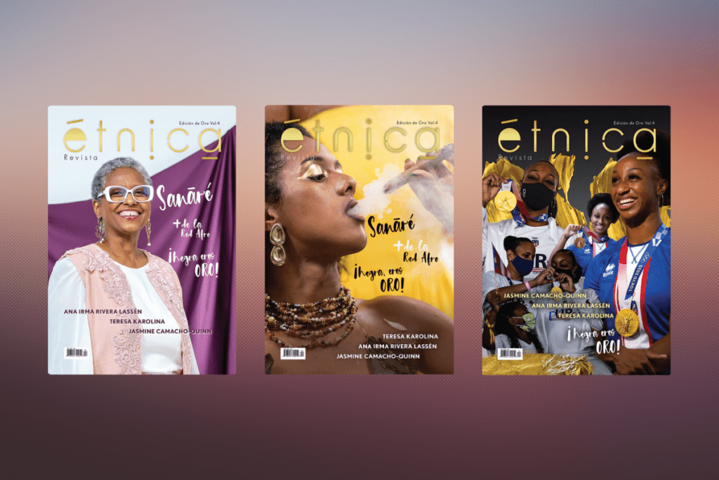 La edición dorada de Revista étnica cuenta con tres portadas que destacan a tres mujeres negras de oro: la senadora Ana Irma Rivera Lassén, la atleta Jasmine Camacho-Quinn y la primera mujer trans negra en ser portada de una revista en Puerto Rico, Teresa Karolina.
