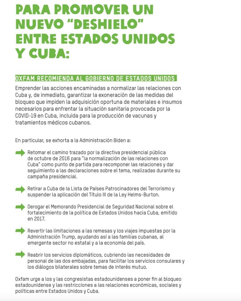 “Las crisis engendran oportunidades. Creemos que esta es una oportunidad histórica para Estados Unidos, a cuyo frente se encuentra la administración Biden-Harris, para adoptar una nueva política de relaciones respetuosas y constructivas con Cuba. Oxfam llama a ponerle fin al bloqueo norteamericano para rectificar las injusticias cometidas contra cubanas y cubanos que luchan por su derecho a vivir sin bloqueo”.