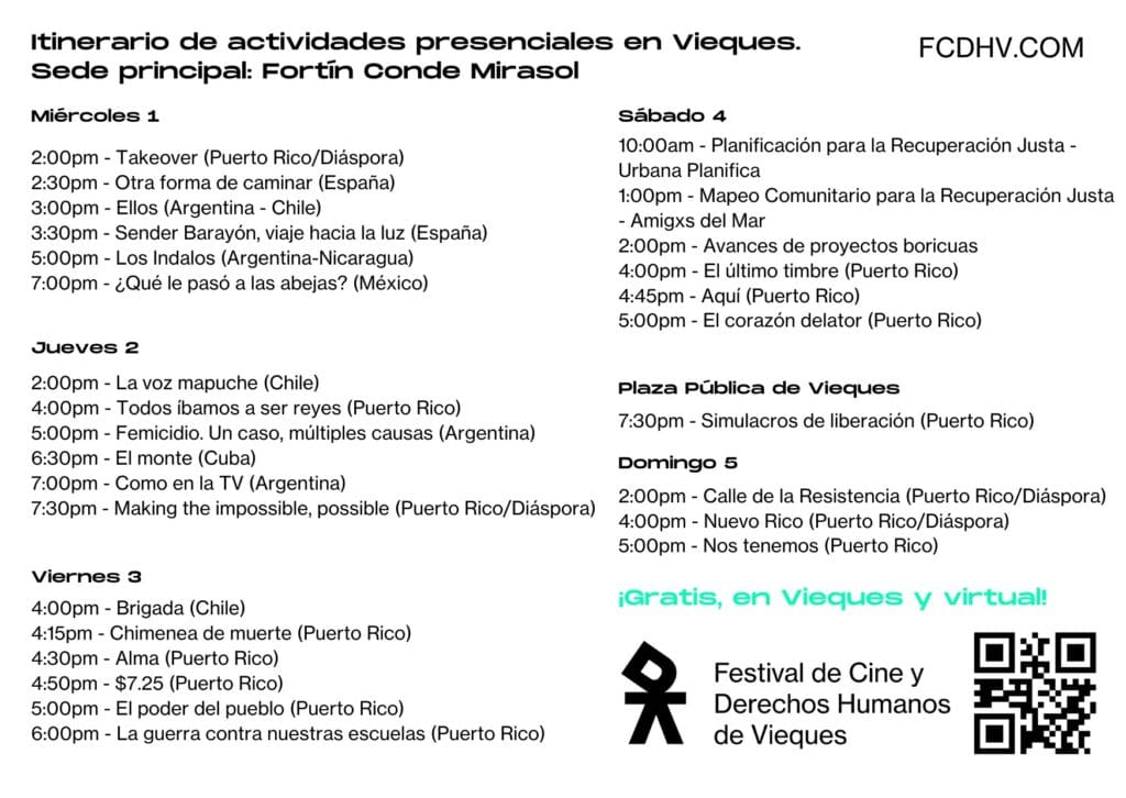Con un enfoque en los procesos de recuperación justa, este miércoles iniciará la segunda edición del Festival de Cine y Derechos Humanos de Vieques (FCDHV), que ofrece al público una cartelera gratis de alrededor de 42 producciones del cine local e internacional.