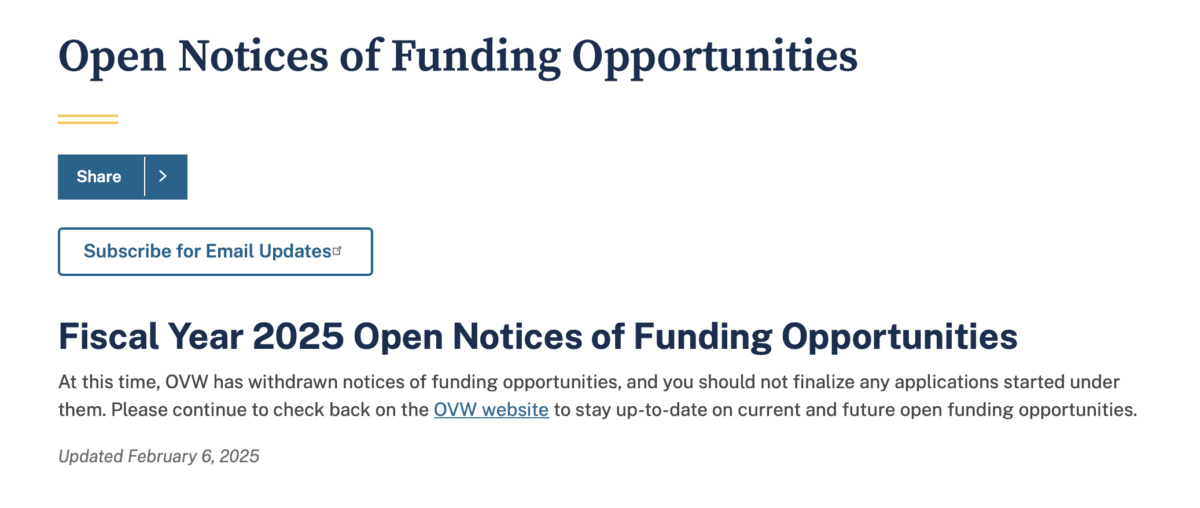 El riesgo aumenta con la proximidad del periodo de presentación de propuestas para el próximo año fiscal. Algunas de las convocatorias de OVW han sido retiradas de su página web, lo que aumenta las dudas sobre si las solicitudes se reabrirán y qué nuevos requisitos se establecerán.
