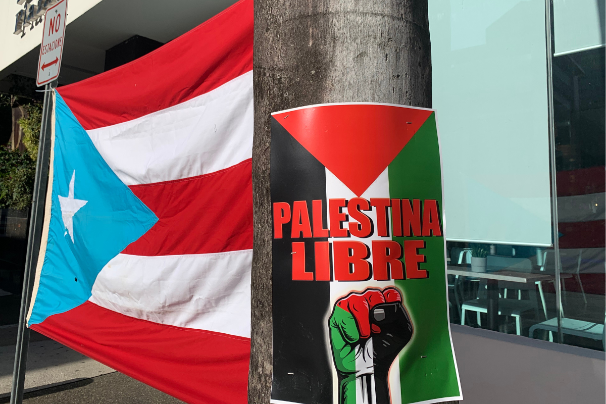 A la calle Bolívar, llegaron decenas de personas con carteles y banderas palestinas y puertorriqueñas. Entre los mensajes que se podían leer en los carteles, se encontraban “No a la guerra criminal”, “Palestina libre”, “Desde el río hasta el mar, Palestina libre será”.