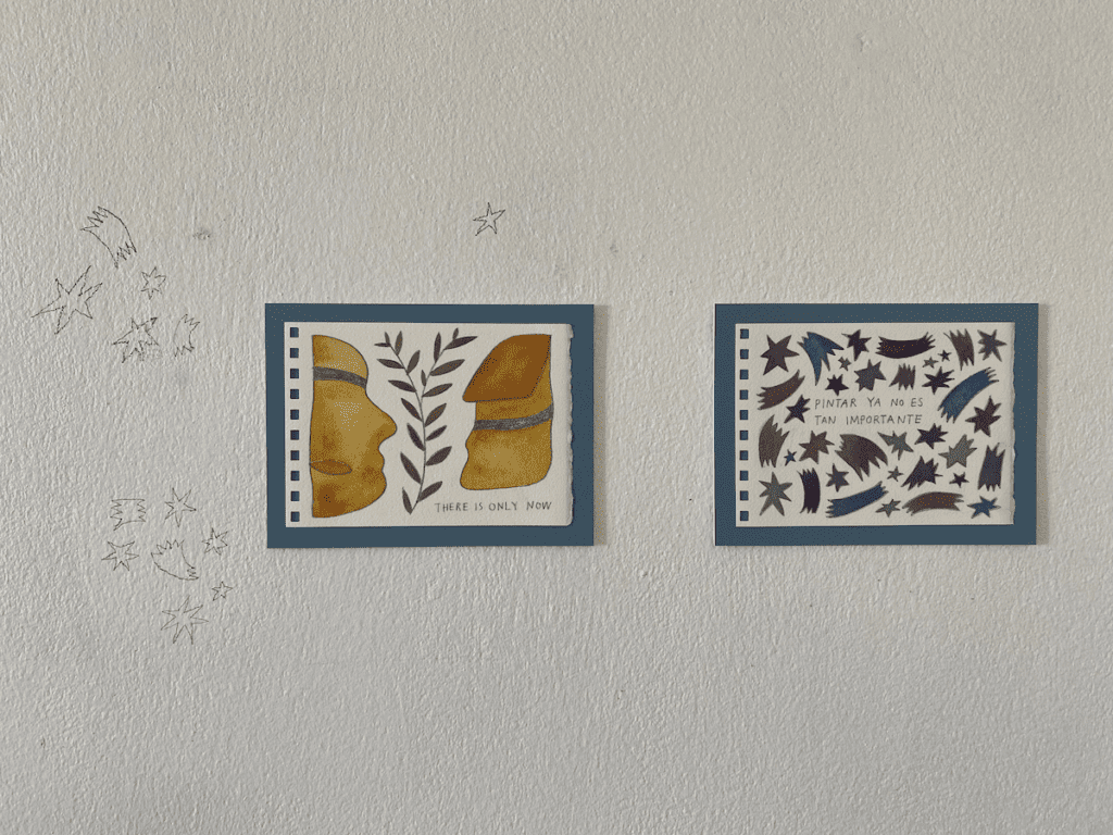 Las obras son pequeñas acuarelas con un mensaje, a veces, en español, otras en inglés, rodeadas con dibujos en lápiz grafito hechos directamente en la pared, casi como una colaboración entre madre e hije. No es la única vez que verán el punto de vista de su cría en la galería. Rosaura incluye piezas montadas al nivel de une niñe como una interrupción al flujo creativo.