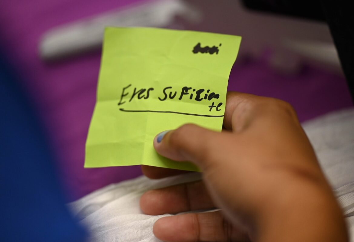 “Escribí estas para mí y para ellas”, dice en otro momento, mientras muestra un “post it” (notita) rosado con tres palabras: “segura”, “alta autoestima” y “bendecida”. Cuando dice “ellas” se refiere a sus compañeras de la Casa Protegida Julia de Burgos, mujeres de diversas edades y trasfondos sociales que le han acompañado en su proceso de sanación. Juntas tejen una red de solidaridades y afectos que no siempre es perfecta, pero que ayuda a reconstruirse de adentro hacia afuera.