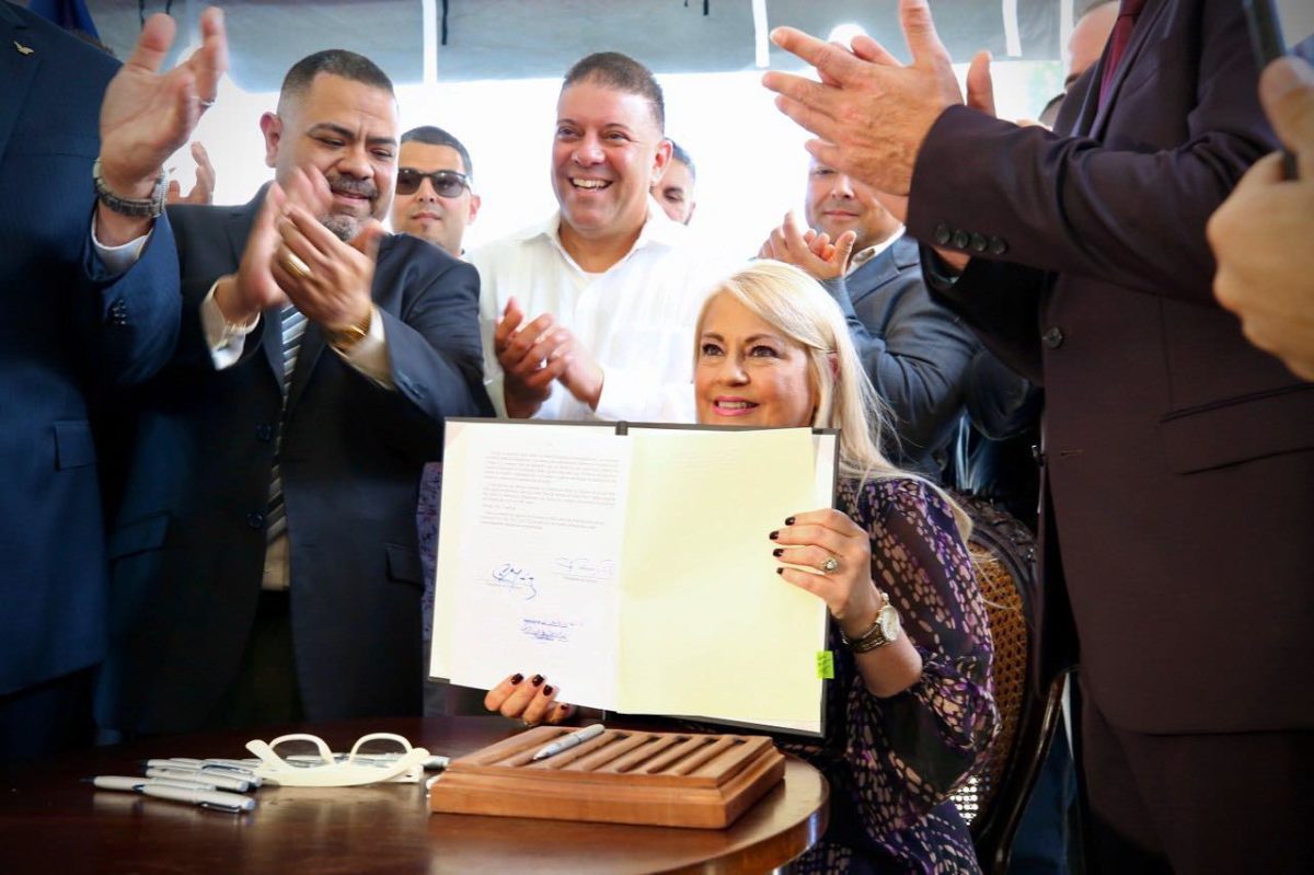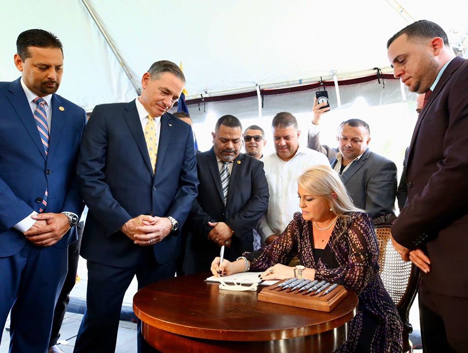 Nótese cómo estos hombres varones masculinos rodean y observan con mucha atención que esta mujer (“la que tiene el poder”), la gobernadora Wanda Vázquez Garced, firma un papel que tiene una ley pa’ que portar armas sea una cosa ahí más rapidita, expedita, contentita… Felices perdices.