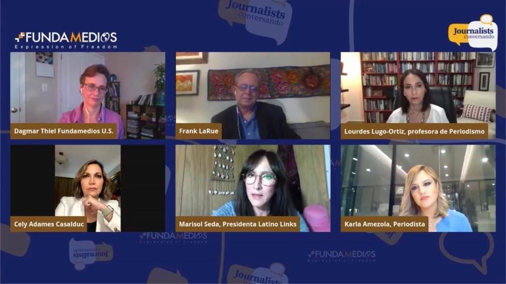 En el conversatorio moderado por Dagmar Thiel y Frank La Rue, también participaron la corresponsal de noticias en Telemundo Miami Karla Amezola Balagüer y la catedrática de la Escuela de Comunicación de la Universidad de Puerto Rico, Recinto de Río Piedras, Lourdes Lugo-Ortiz.
