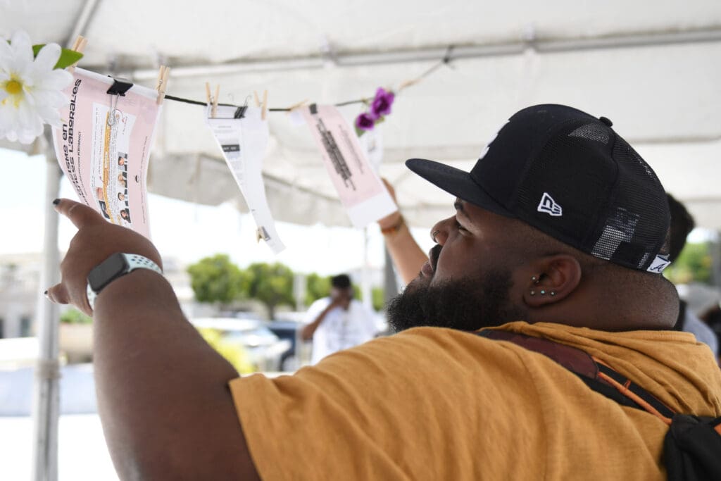 Bajo una de las tres carpas blancas ubicadas frente al Capitolio, colgaban dos filas de reglamentos escolares con prohibiciones de estilos de cabello étnicos y experiencias de estudiantes.