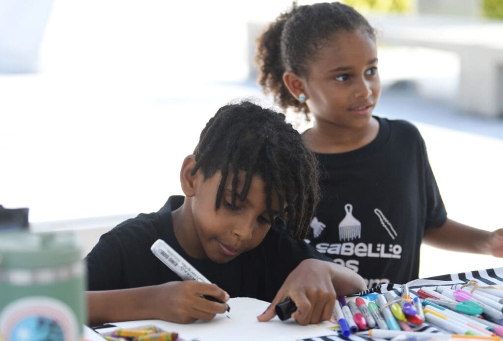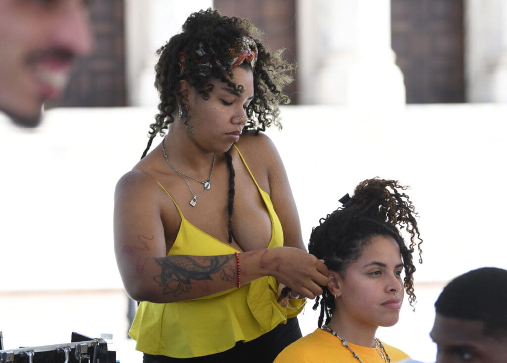 La protesta contó con estaciones de arte, lectura para niñes, trenzado de cabello, colocación de turbantes y recortes. Fue animada por la música de la banda afrocaribeña Imbuyè.